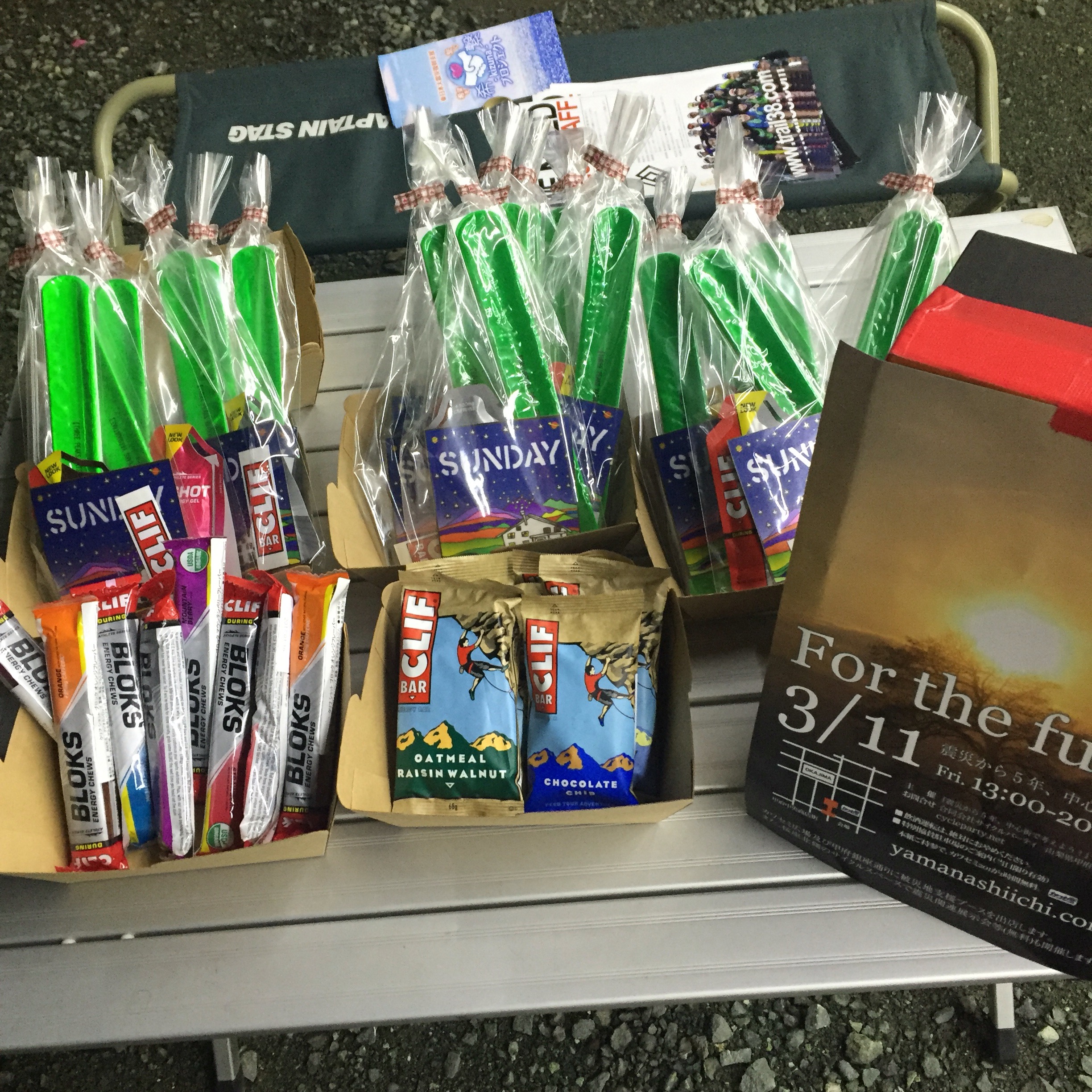 クリフバーさんのご協力もあり、ステッカーやグミ、リフレクターなどをセットにした参加賞を1つ500円で販売。