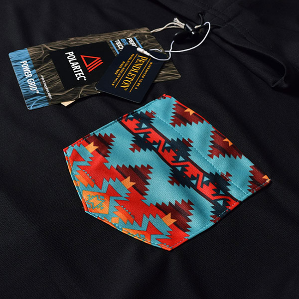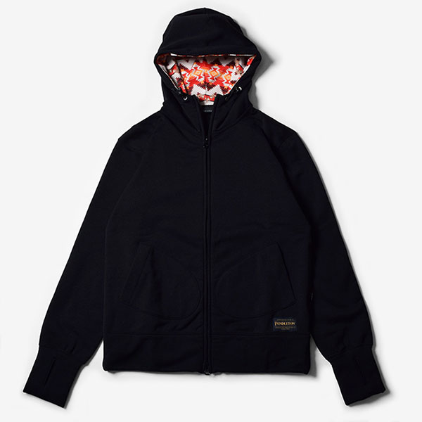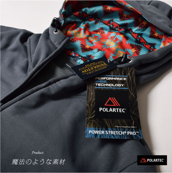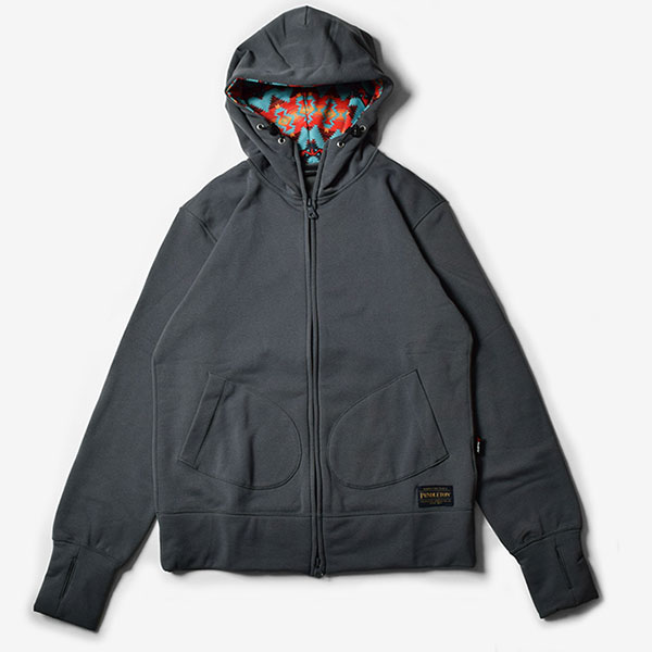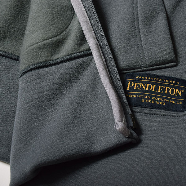 襟元を高くして防寒性を高め、フード裏は「MMA×Pendleton®オリジナル柄の「Mountain Majesty」を昇華転写プリントしたPOLARTEC®︎のPower Dryで切り返している。裾にはPendleton®ネームが付く。