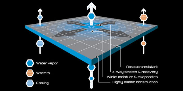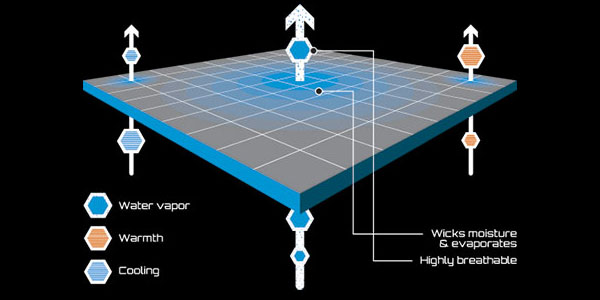 Power Dryは二重ニット構造により高い吸水速乾性を持つ。軽量かつ通気性が高く、マットでしっとりとした質感はスポーツ用化学繊維にありがちな光沢感がない。アクティビティに最適な素材であると共に、デイリーに使用しても違和感がなく、着て心地よい。