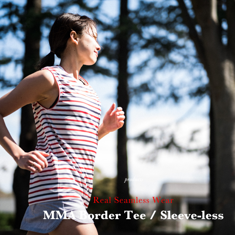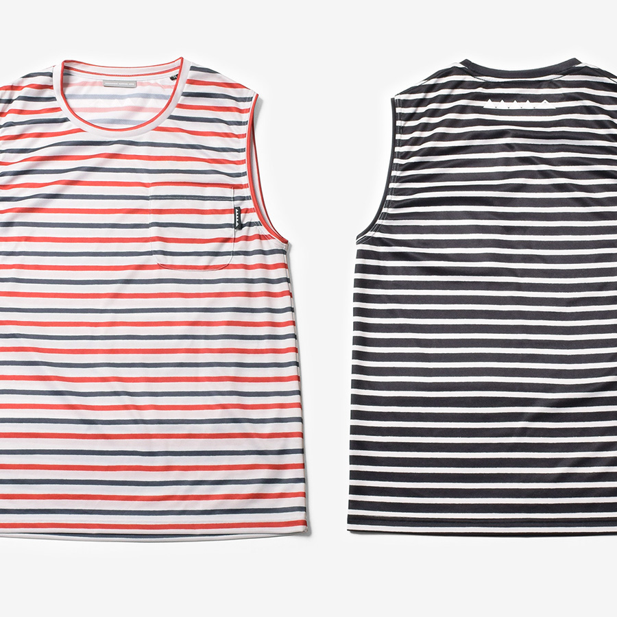 そうして2016年に登場したMMA Border Tee / Sleeve-less。特徴的なのは「ボーダー」ではなく「ボーダーの古着」を機能を損なわない昇華転写で全面プリントし、織り目やシワなどもリアルに表現されていること。手に取った時から味わいがあり、そのTシャツは様々なシーンで着ることができる。