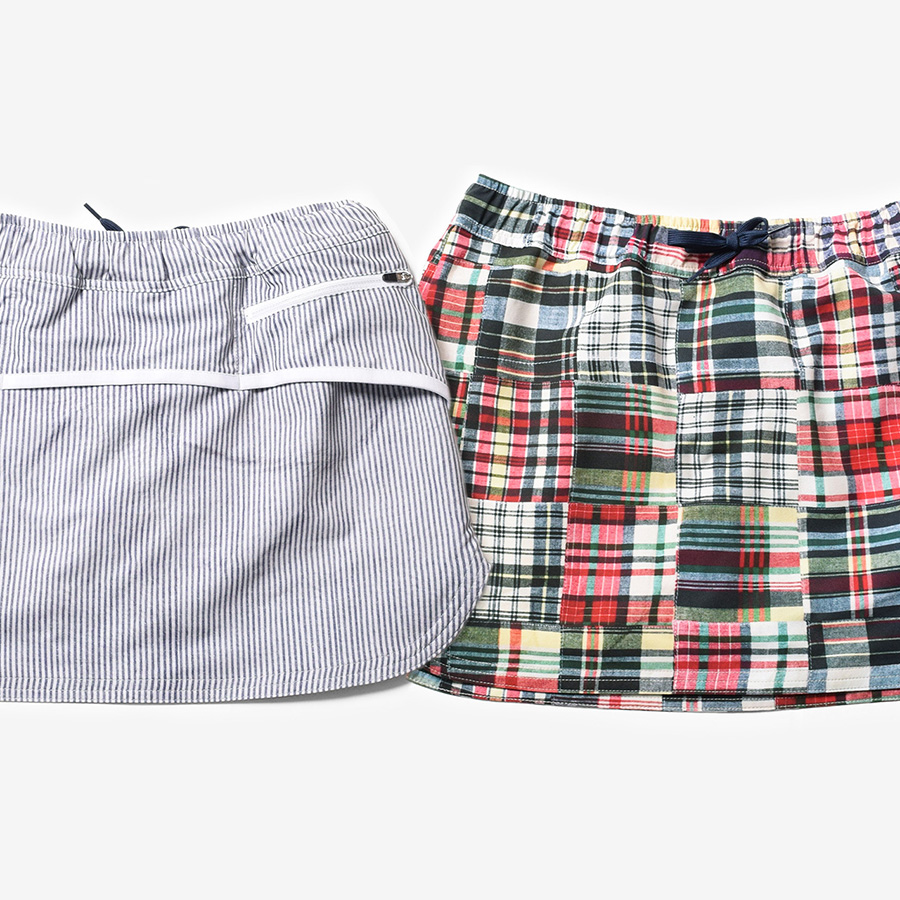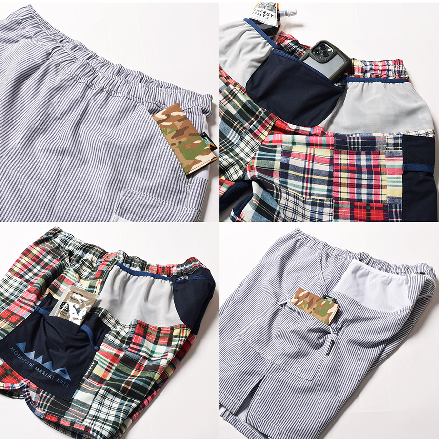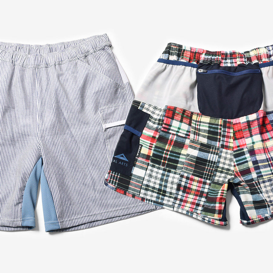 そのアメトラを代表するパッチワークとシアサッカーを昇華転写プリントで表現。定番の7pocket Run Pants、3pockt Run Skirtに加えて、ハーフジップのBDシャツを製作した。素材自体が持つ速乾やストレッチ機能はランで有効であることに加えて、プリント技術の向上でリアルに表現された柄は、そのままタウンユースとしても使用できる。