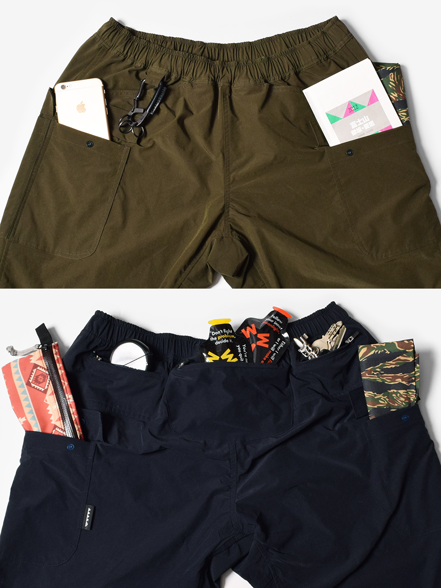 背中に7pocket Run Pantsと同形状の3つのポケット、サイドに大きめのポケットなど、合計8つのポケットを備え、スマートフォンや財布など常に持ち歩くモノに加えて、パスポートやトレッキングマップなど、シチュエーションに応じて収納可能。