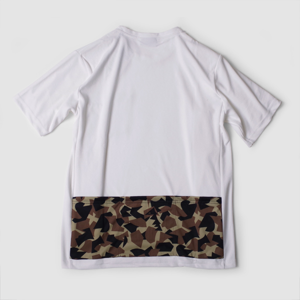 フロントにはポケットTシャツの王道デザイン、左胸にポケットを付けている。そしてバック腰部分にはバイクジャージに見られるディティールである大型のポケットを装備。仕切りをつけて使い勝手を向上させている。イメージを広げて活用して欲しい。