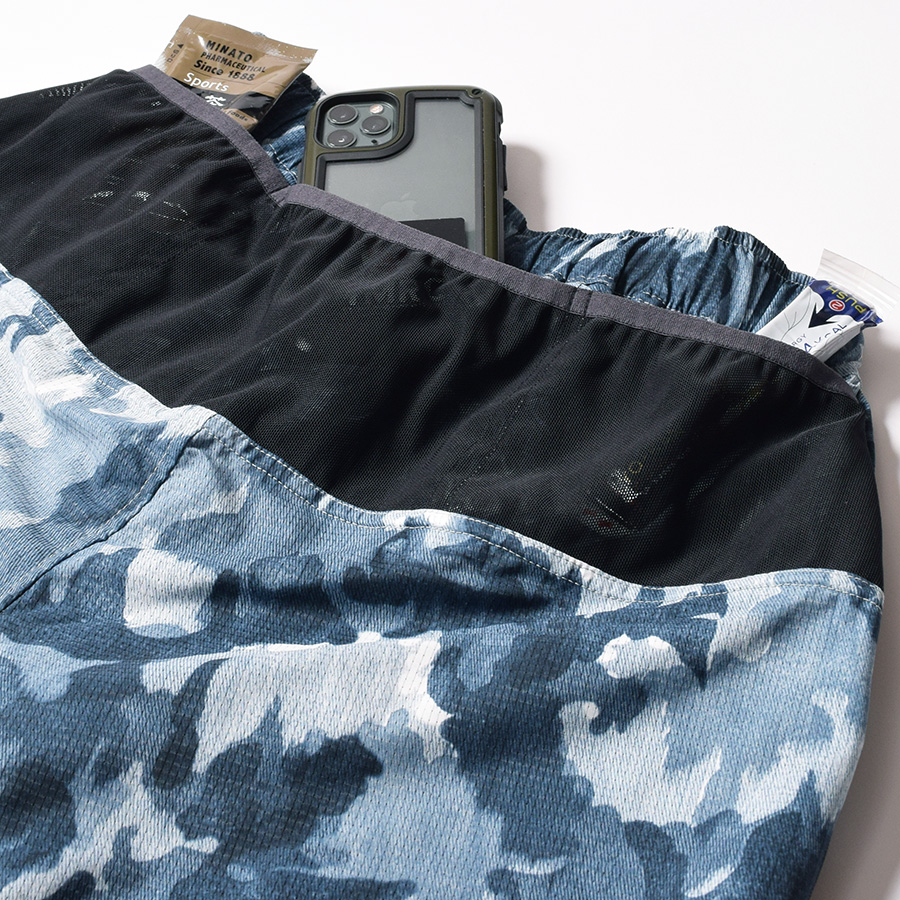背部に装備するパワーメッシュの三連ポケットには、補給や鍵、スマートフォンなどが収納可能。足の稼働域を広げるガゼット部分は伸縮性を持つ速乾素材で切り返している。