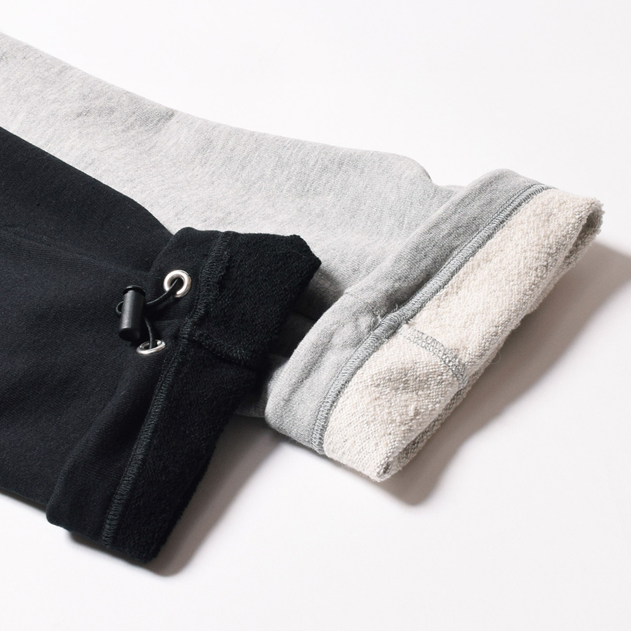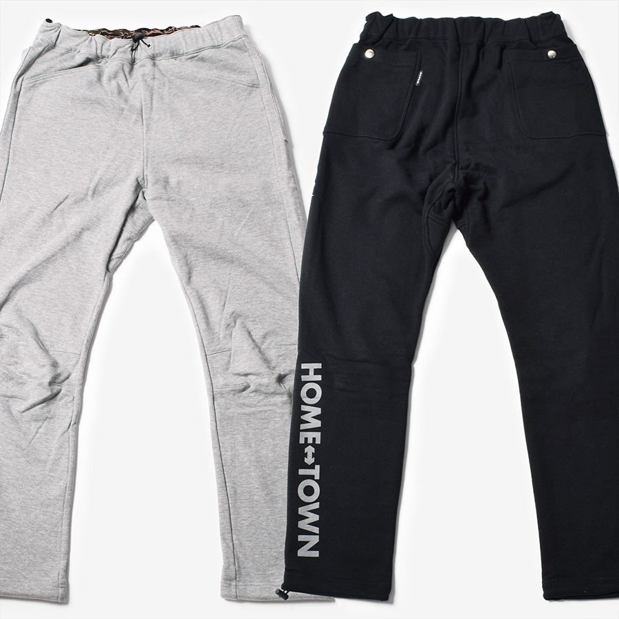 ジョガータイプのスウェットパンツ。日本製のボディはリラックスした着用感で、クライミングパンツをベースに股上を深めにしたハイウエスト。動きやすいうえに着用時に腹部や背中が出にくい。バックポケットは座り心地を優先し、座った際の干渉を避けてサイド寄りにつけたスマートフォンが入る縦長サイズ。どこにいても快適に感じられる動きやすさと、履いた際のシルエットの良さを両立している。左足裾には「HOME←→TOWN」のプリント。