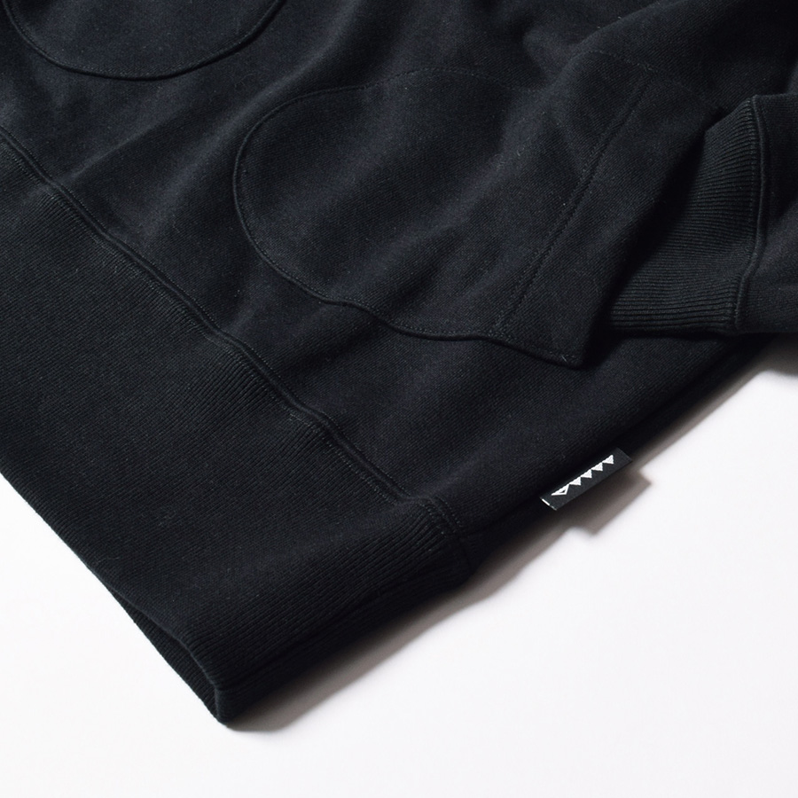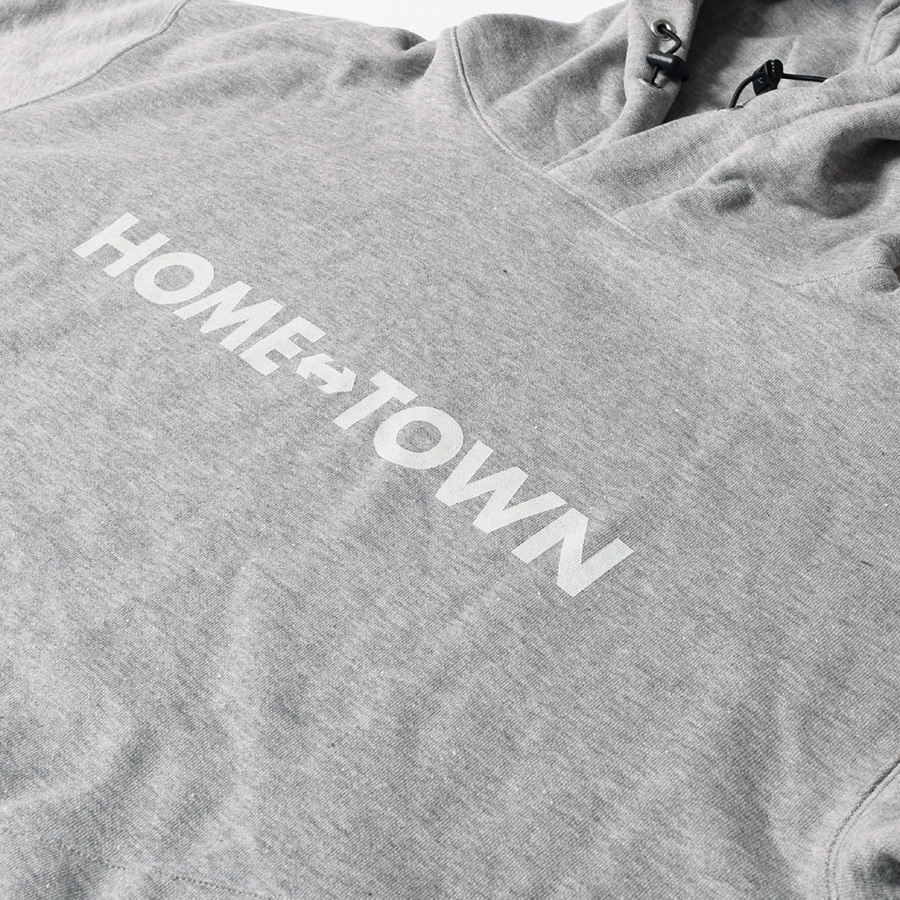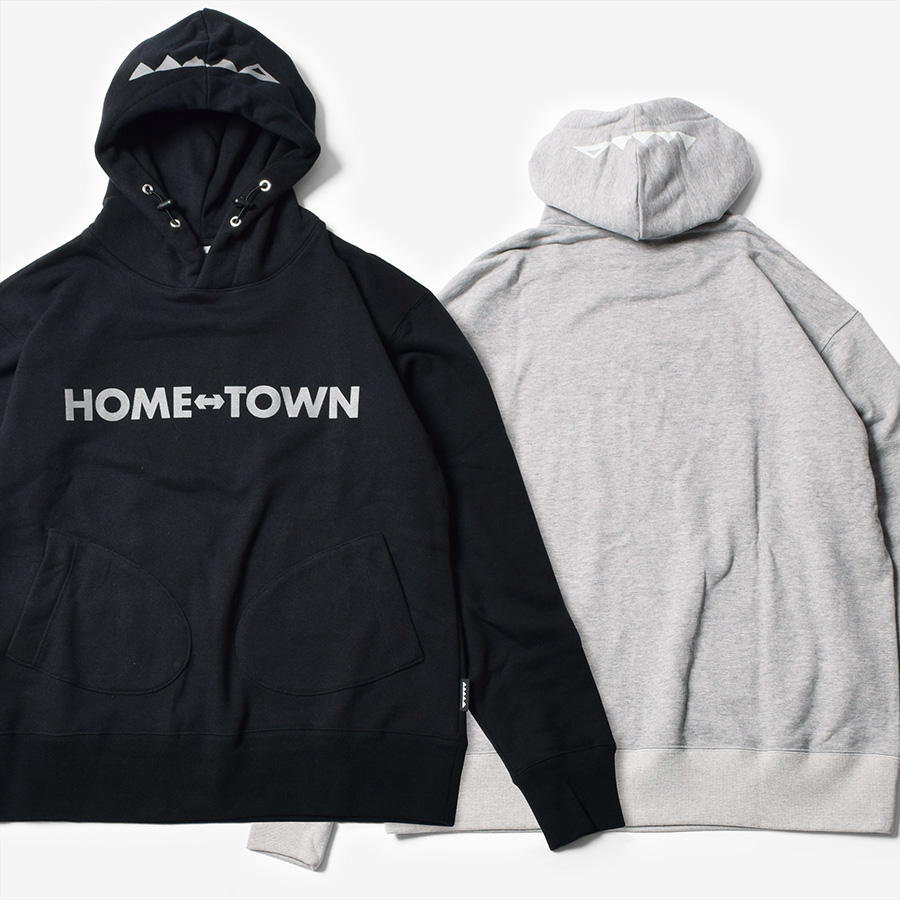 プルオーバータイプのスウェットフーディー。日本製のボディはリラックスした着用感のゆとりのあるシルエット。常は紐で調整するフード部分のコードはアウトドアウェアに使われるドローコードで機能的であると共にわずらわさを解消。カンガルーポケットではなく、左右に分けたラウンドタイプのポケットがデザインの特徴となっている。胸元には「HOME←→TOWN」のプリント。