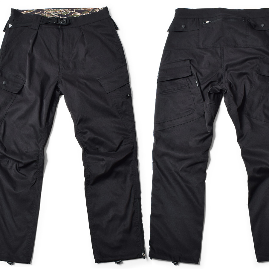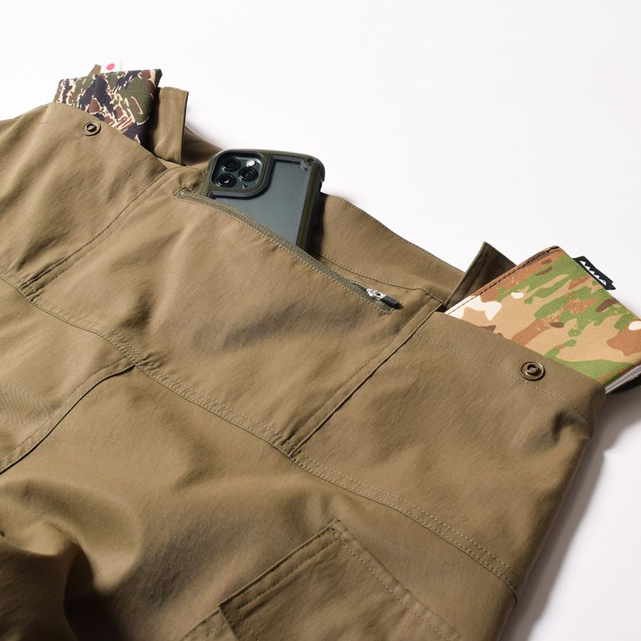 合計9つのポケットは入れる物に合わせて使い分けることができるように様々なサイズに設定。フロントポケット2つ、背部の3連ポケット、そして脚部のサイドポケットは左右アシンメトリーで大小4つを装備。座った際にも出し入れがしやすいように斜めに配置している。