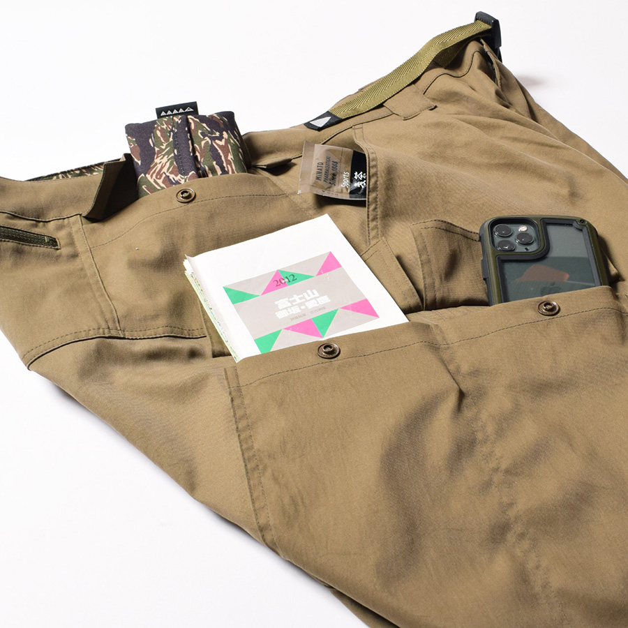 日本製のオリジナルボディはリラックスして着用できるように、クライミングパンツをベースにヒップと渡りに余裕を持たせ(ワンタック)、裾に向かいテーパードするデザインにアレンジ。多くのポケットを備えながらも、動きやすさと履いた際のシルエットの良さを両立している。