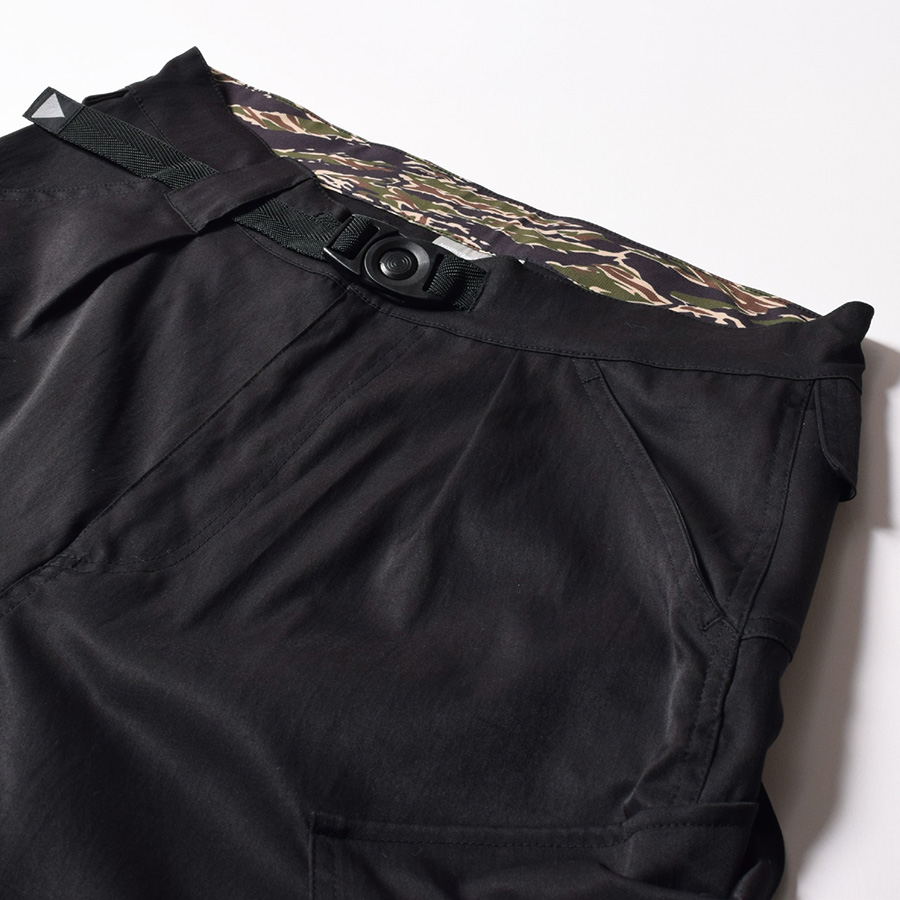 ウエストはベルト不要のウェビングベルトで、調整が容易なのはもちろんのこと、空港の金属探知に引っかからないのが旅行者にとってはポイント。ウエスト内側はMMAオリジナルのタイガーカモ柄をプリントした吸水速乾素材で切り返している。