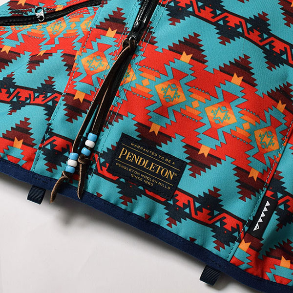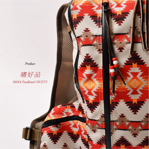 Pendleton®とのコラボレーションにより誕生した“MMA Pendleton® DUSTY”は、Pendleton®の代表的な柄「Mountain Majesty」をベースとしたオリジナルグラフィックをプリント。ファスナーの引き手はアメリカンスタイルを感じるディアレザースキンで、コンパートメント部の引き手はビーズで飾っている。