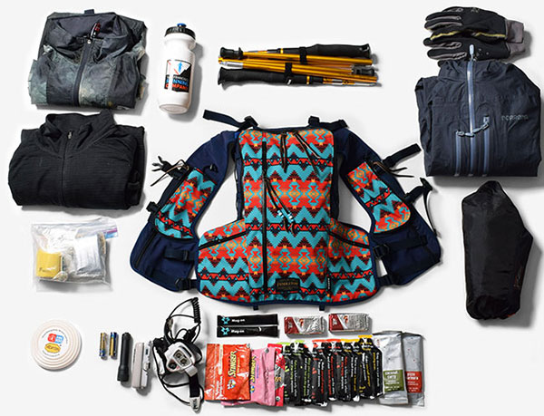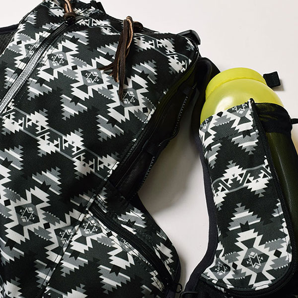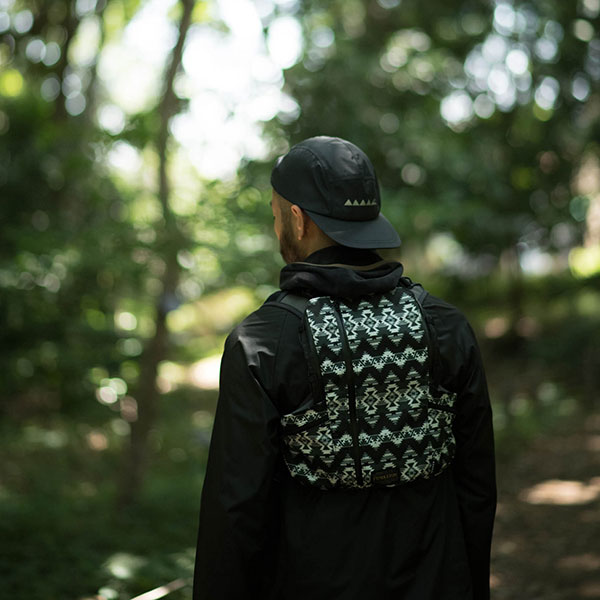 MMAオリジナルのランニングバックパック“DUSTY”は「特化していない」=「ひとつで幅広い対応が可能な汎用性の高さを持つ」ことを目指し、3箇所のアジャスター、開閉するハーネスのボトルホルダー、逆台形の本体など、MMAの考える機能を詰め込んでいる。