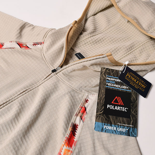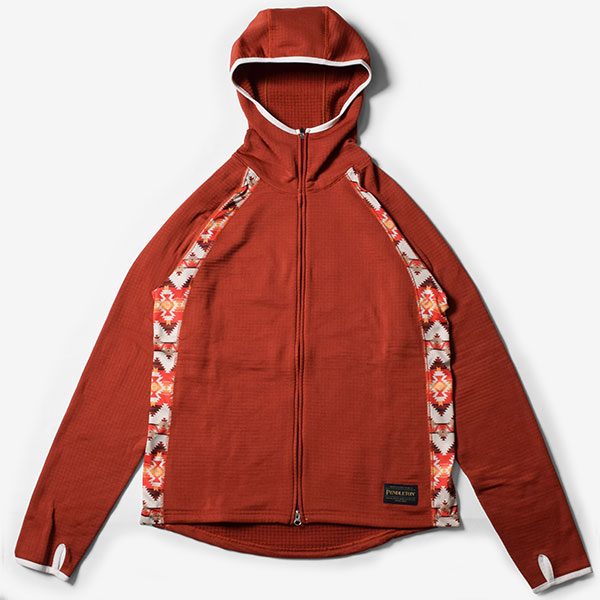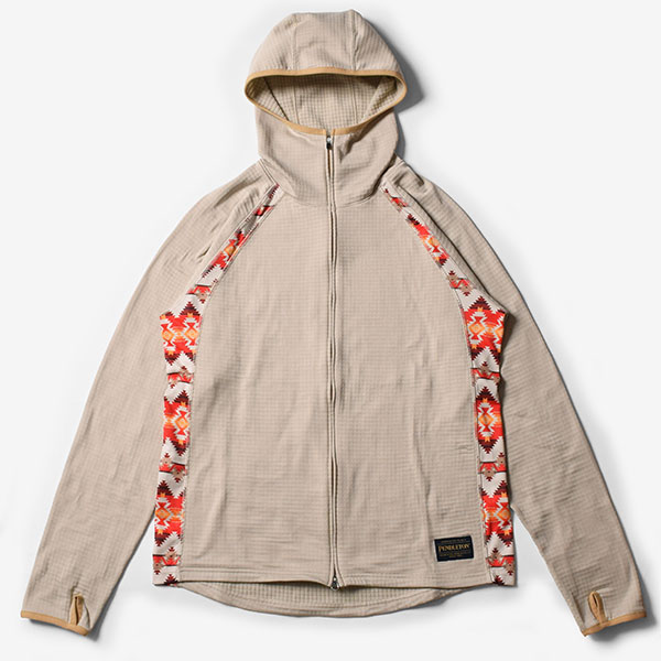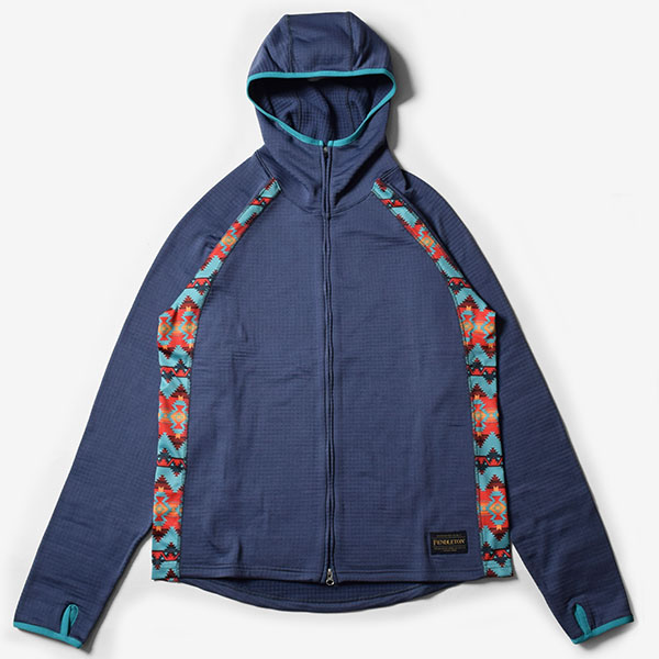 ボディはフロントが全開するフーディータイプ。ナチュラルシルエットでアクティビティ時だけではなく、デイリーにも使いやすい。首元から脇にかけて「Mountain Majesty」をベースにアレンジしたMMAオリジナルの柄を昇華転写プリントしたPOLARTEC®︎のPower Dryで切り返している。裾にはPendleton®ネーム。