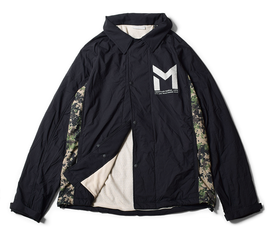 アメリカンカルチャー、スケートボードを愛好するスケーターたちが着用するコーチジャケットをモチーフとしたウィンドシェル。ボディ表面には撥水、透湿、ストレッチ機能を持つ軽量ナイロン、ライナーには「POLARTEC® Alpha」を使用。フロントはZIPとボタンの二重留めの比翼仕様。サイド部分にオリジナルデジタルカモ柄をプリントした東レの軽量撥水素材「Dot Air®︎」で切り返している。
