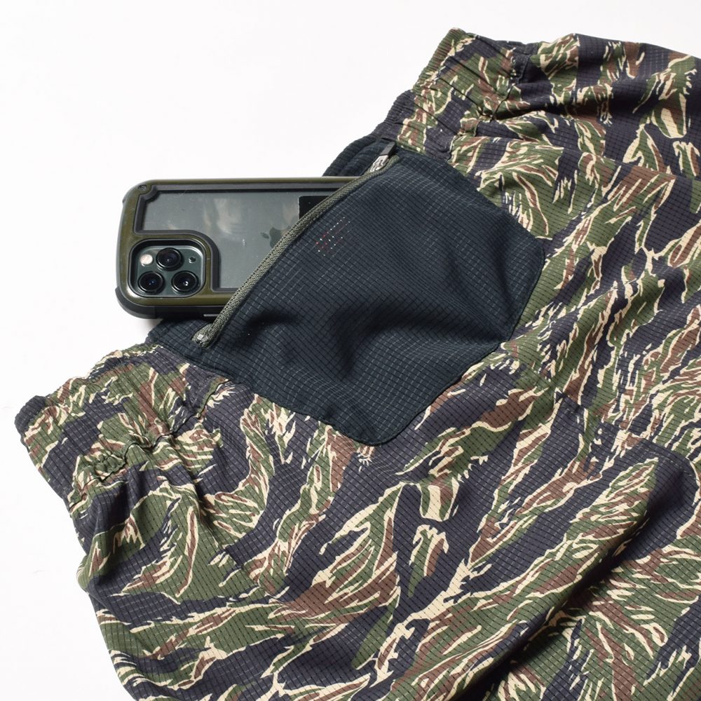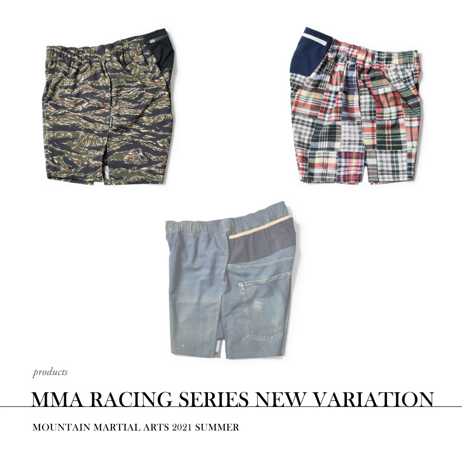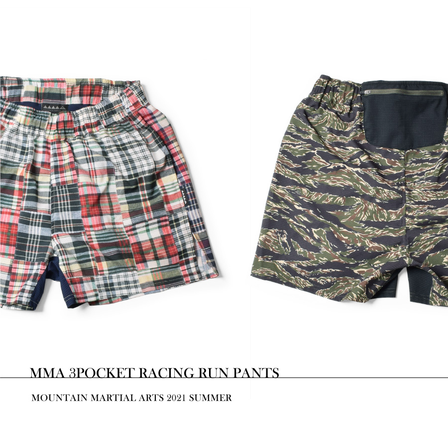 そうして誕生したのが「MMA 3pocket Racing Run Pants」。レーシングシリーズのブラッシュアップというよりは、新しいバリエーション。プリント柄もデニムと並んでMMAの定番柄であるオリジナルのタイガーカモとヴィンテージ古着からデータを起こしたパッチワークにすることで雰囲気を変えた。