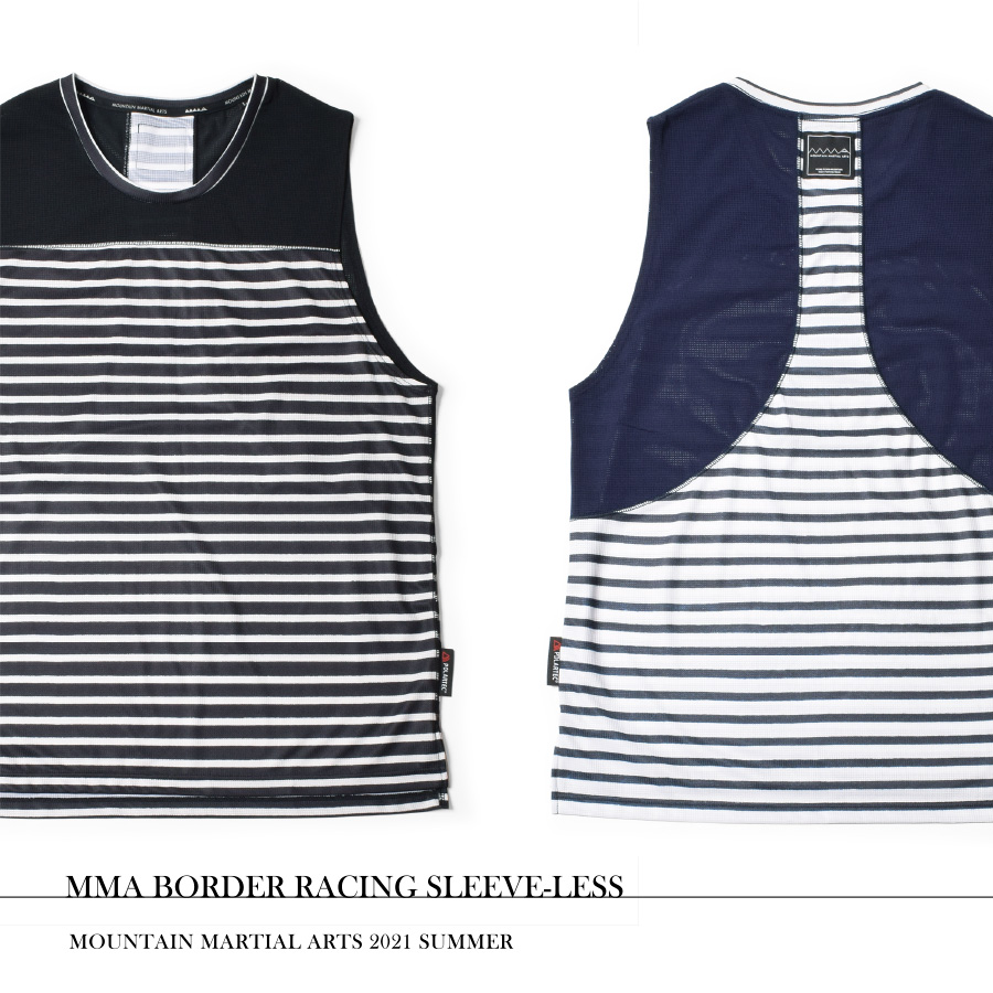 凹凸感のあるグリッド状の表面が特徴的なPOLARTEC® Power Dryを使用したレーシングスリーブレスは、胸から上、背面の肩甲骨部分を大胆にメッシュで切り替え通気性を向上させ、形状もランニングの長時間の着用でもストレスが軽減するデザインを追求した。仕様や素材に変更はないものの、夏らしいボーダーを機能を損なわない昇華転写でプリント。ソリッドバージョンとは異なる印象となった。