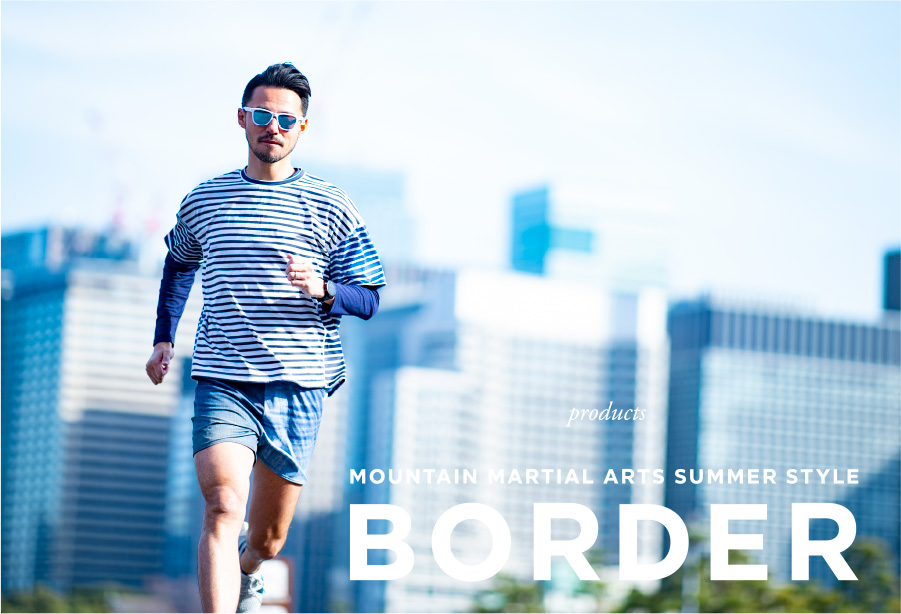 トレイルランニング、ランニング、ハイクでもボーダーで楽しみたい。機能素材に「ボーダーの服」を全面転写プリントしたMMAの定番プロダクト。