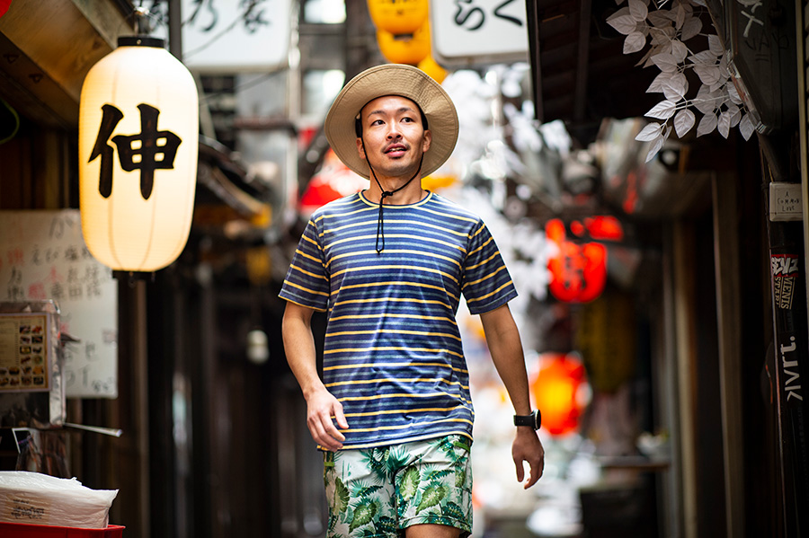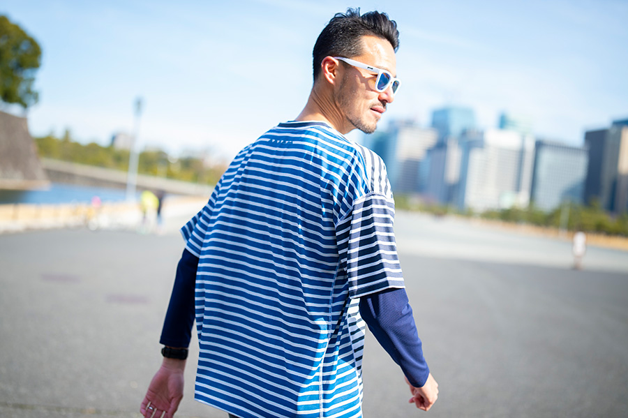 少しゆとりのあるシルエットは、暑い夏でもリラックスした着心地。生地は吸水速乾性・UVカットを持つ機能素材なので、タウンユースでもランでも機能を体感できる。