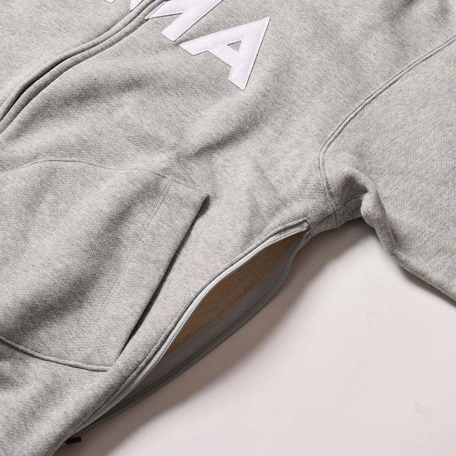 フード部分と胸にはフェルト刺繍を施し、脇にはファスナーによるベンチレーションを装備した。ボリューミーなスウェット素材でも、ベンチレーションによって蒸れを調整可能。アウトドアで見られるディティールをオーセンティックなフーディースウェットに組み合わせた。