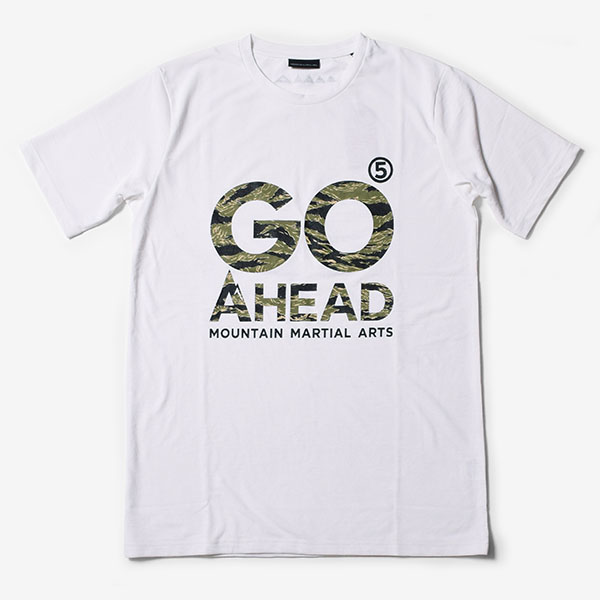 コットンライクなポリエステルボディに「GO AHEAD(前に進む)」というブランドスタンスをプリントしたTシャツ。「GO AHEAD」の文字はMMAの定番柄であるオリジナルタイガーカモに。