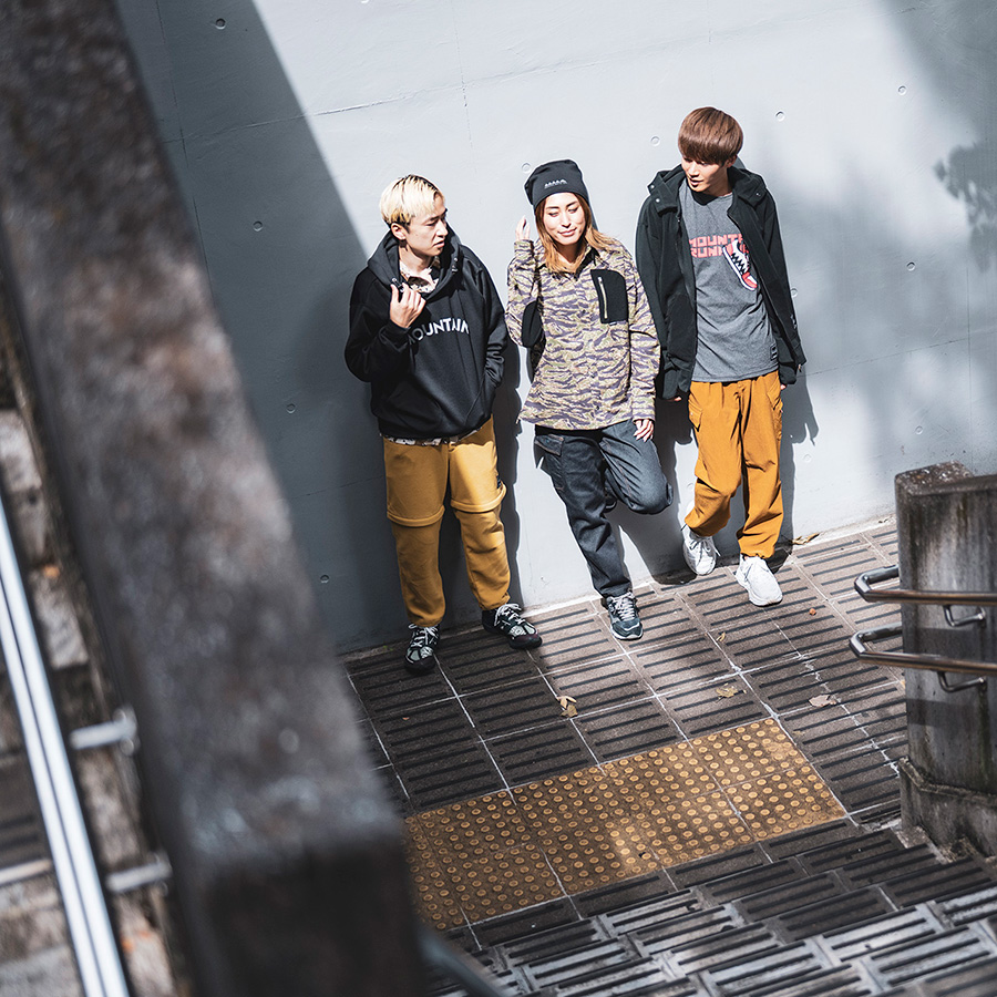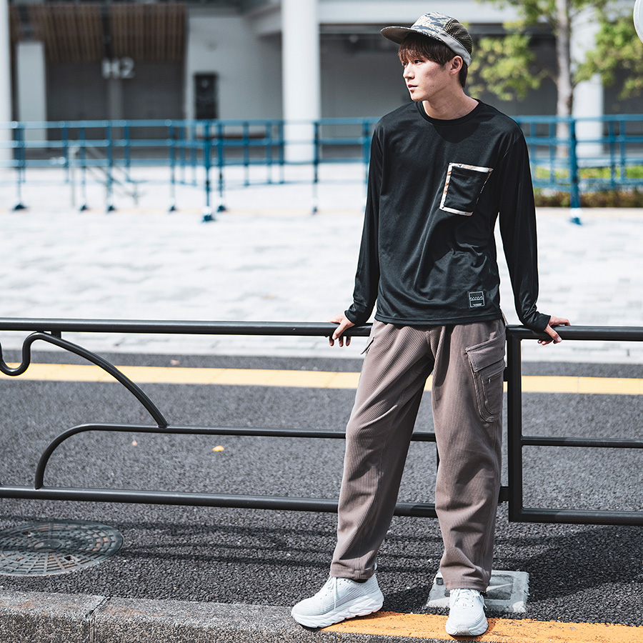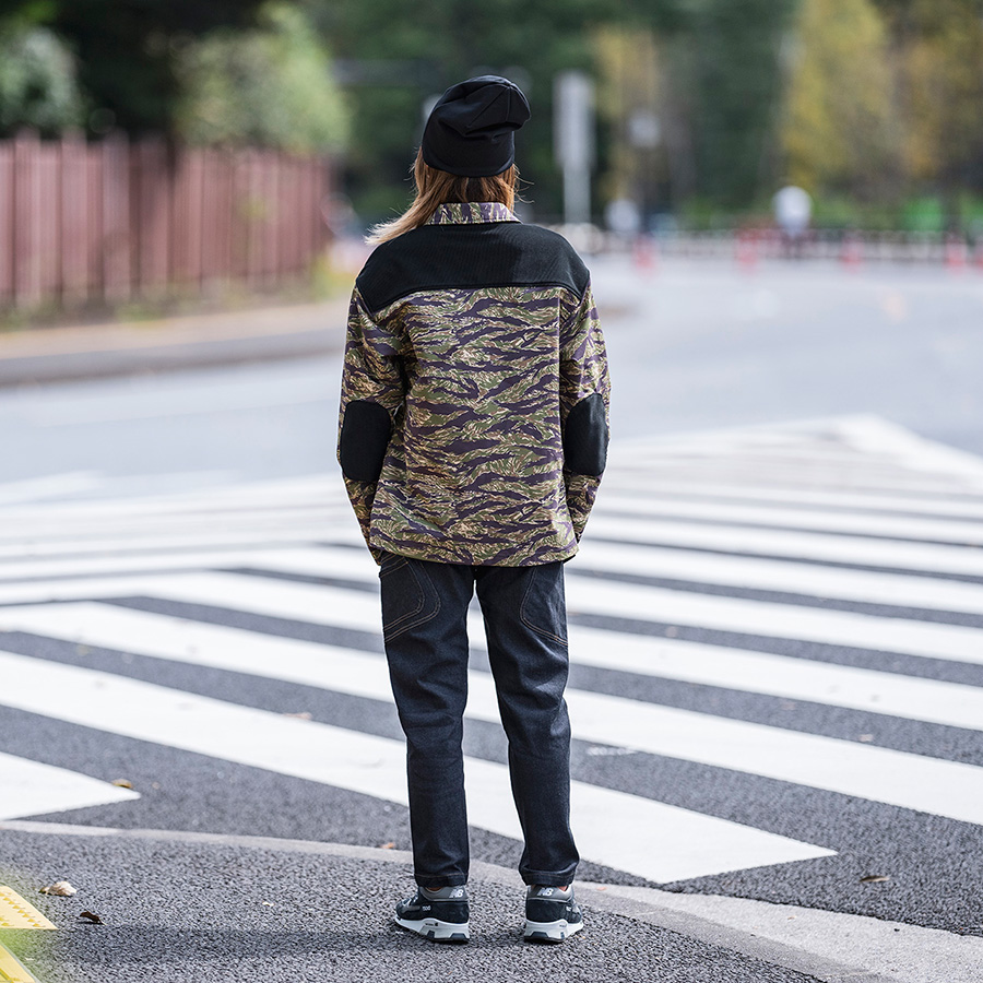 カモフラージュのシャツはランニングパンツと同じ吸水速乾機能を持つ素材を使っている。リジッドに見える濃いデニムは、高強度のナイロン「CORDURA®」の糸を混ぜて織られている。黒のフーディーはPOLARTEC®の高機能素材「Power Stretch」だ。ショーツにもなる2ウェイのフリースパンツも、POLARTEC®の「Micro Series Fleece」。薄いのにとても軽く、暖かい。ハイスペックな素材にあえてクラシカルなコーデュロイを組み合わせてみる。でも、そのコーデュロイもコットンではなく、高ストレッチの合繊で出来ている。