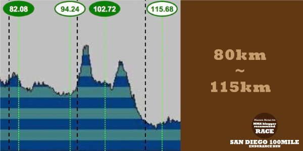 80km地点のSunriseエイドではMiekoさんが迎えてくれました。又聞きで私の参加を知ったという現地在住のウルトラランナー。Koheiさんとも久しぶりに一緒に。