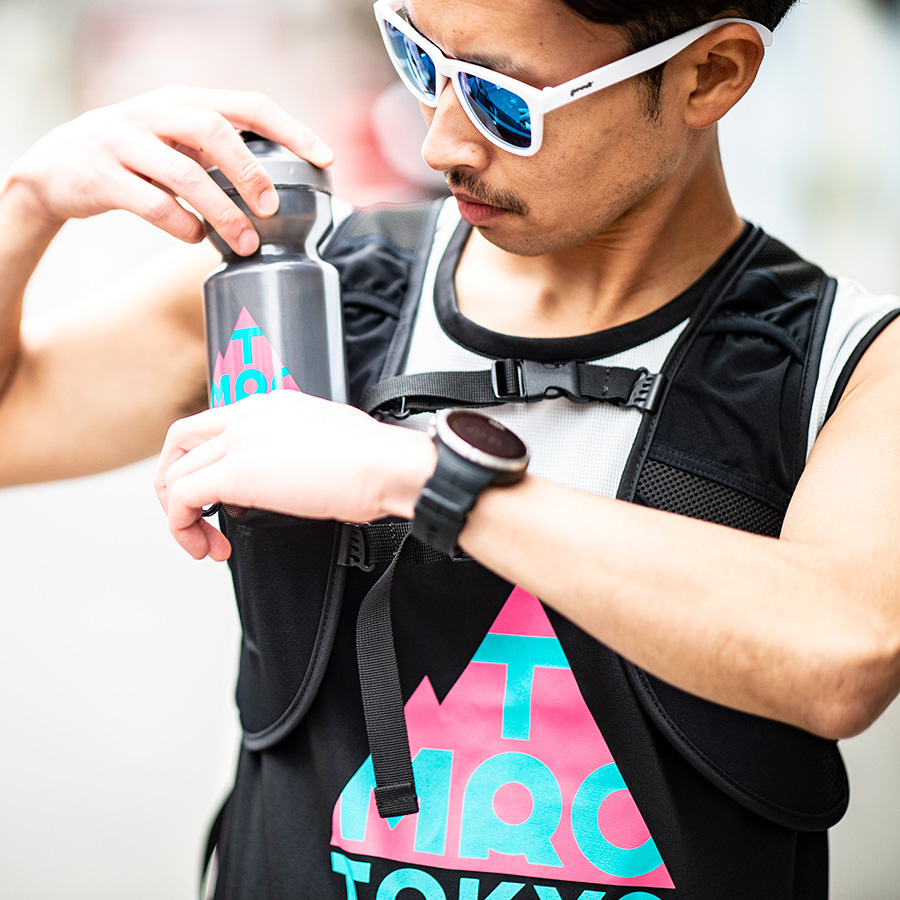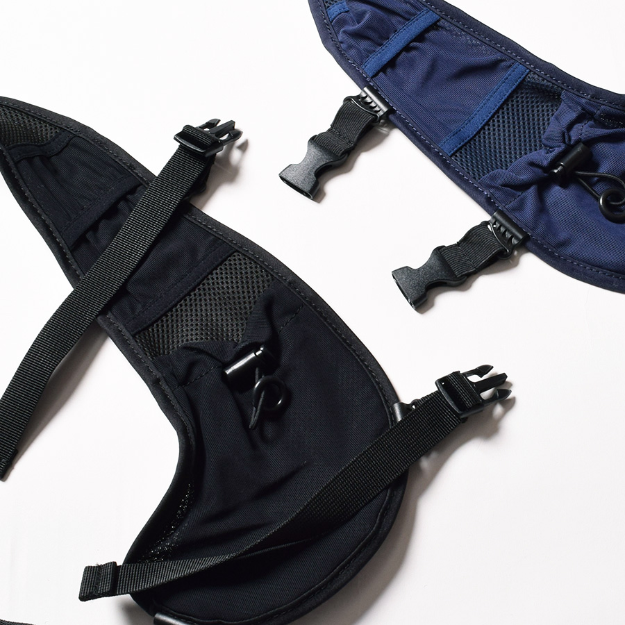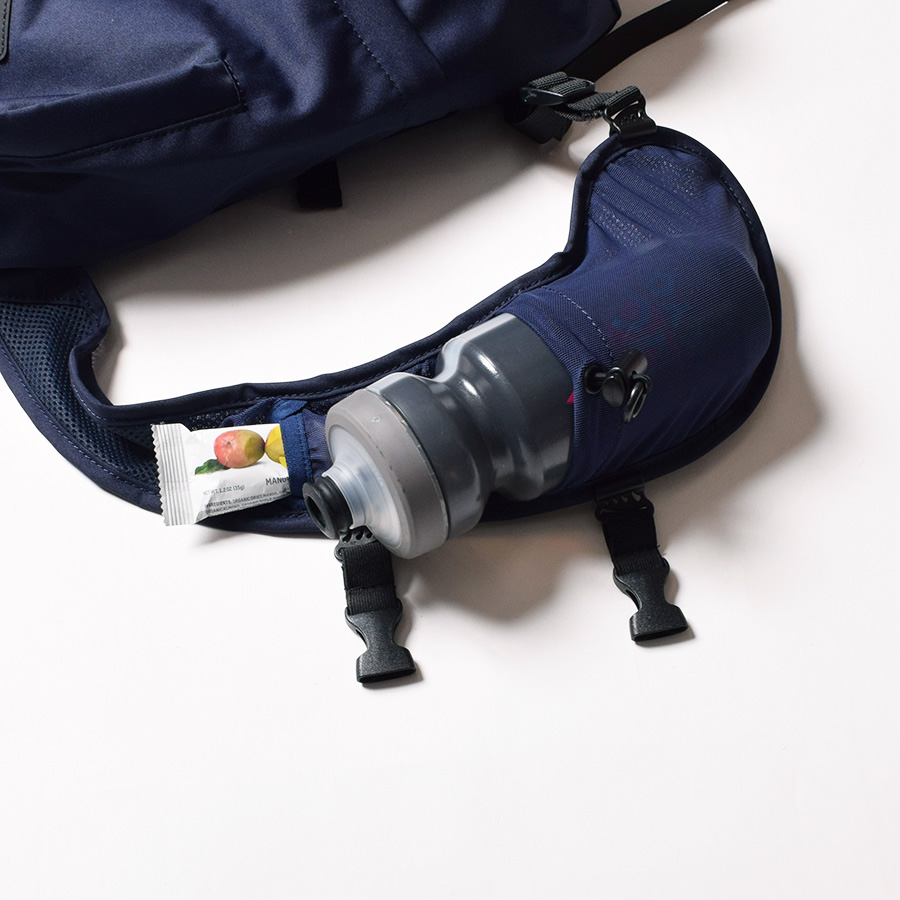 ハーネスにはボトルやフラスク、補給などを入れることができるメッシュポケットを装備。デイリーユースなら、スマホやペットボトルのドリンクを入れてもOK。