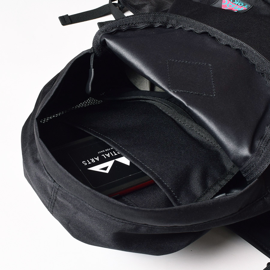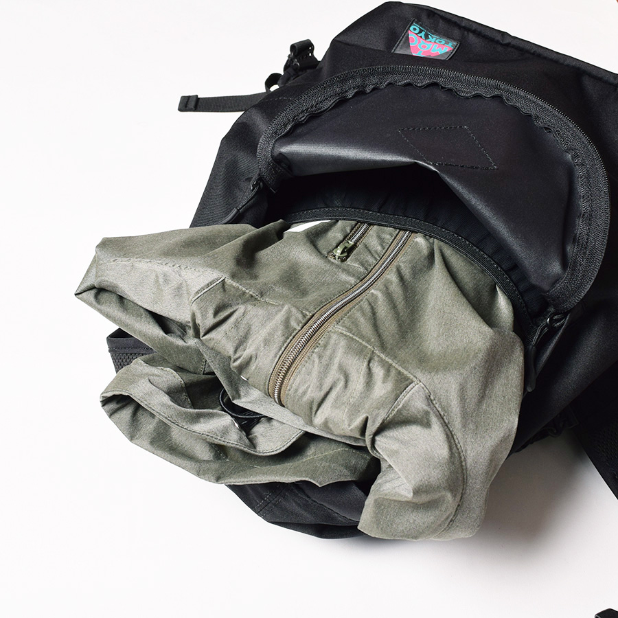本体は1室ながら、背中側にメッシュを貼ってあるため、揺れそうな荷物はメッシュ内に。また、スマホや小型バッテリー、イヤホンなどを入れられる小さなポケットも。小柄なボディながら、本体で約10Lの容量に、ハーネスも活用すれば、デイリーユースで不便さは感じない。