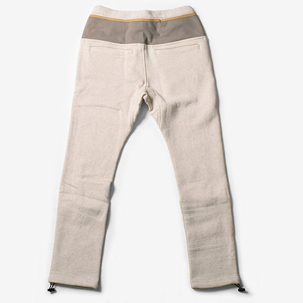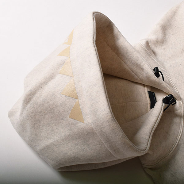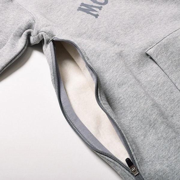 和歌山産スウェットで普通の形のフーディーやジョガーは他のブランドにあるので、MMAはアクティビティウェアのディティールをプラス。フーディーの(個人的に)野暮ったく感じる紐はドローコードにアレンジ。しっかりとしたスウェット素材は高い保温性を持つが、脇下に大きなベンチレーションをつけることで体温調整を可能とした。