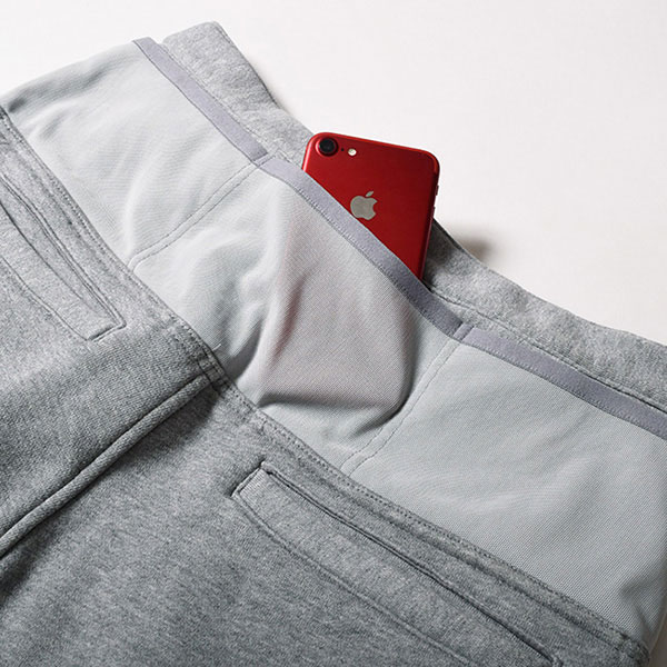 ジョガーには7pocket Run Pantsで採用しているパワーメッシュのポケットを装備。「前と後ろ4つのポケット+パワーメッシュポケット3」で、合計7つのポケット。ヒップに余裕を持たせ、足先に向けてテーパードすることで、美しいシルエットと履き心地のよさを両立している。