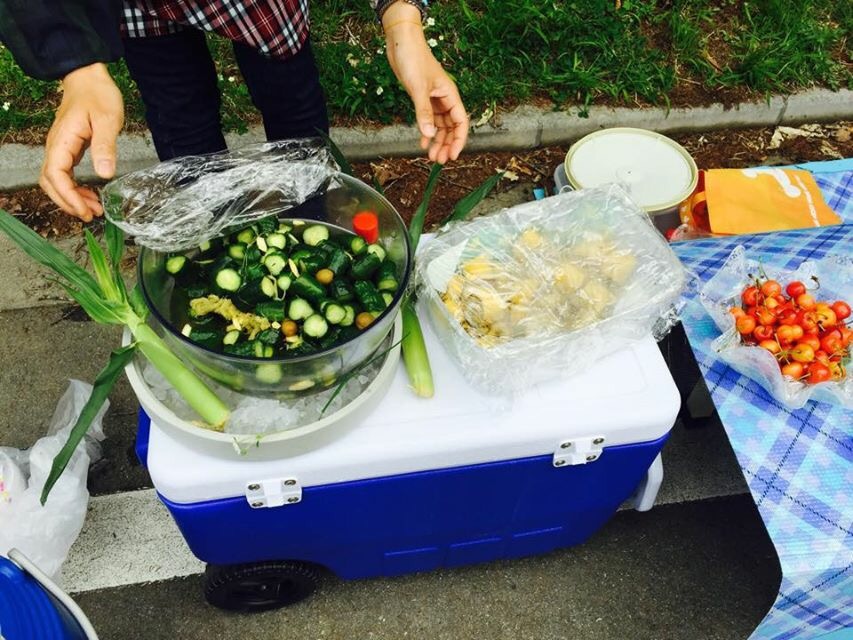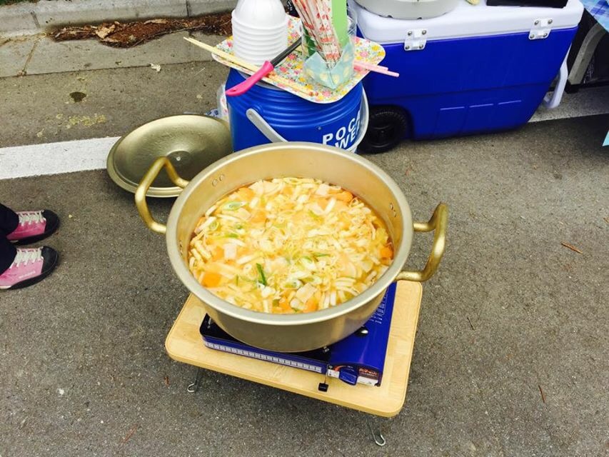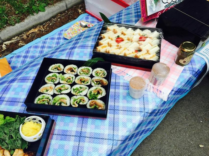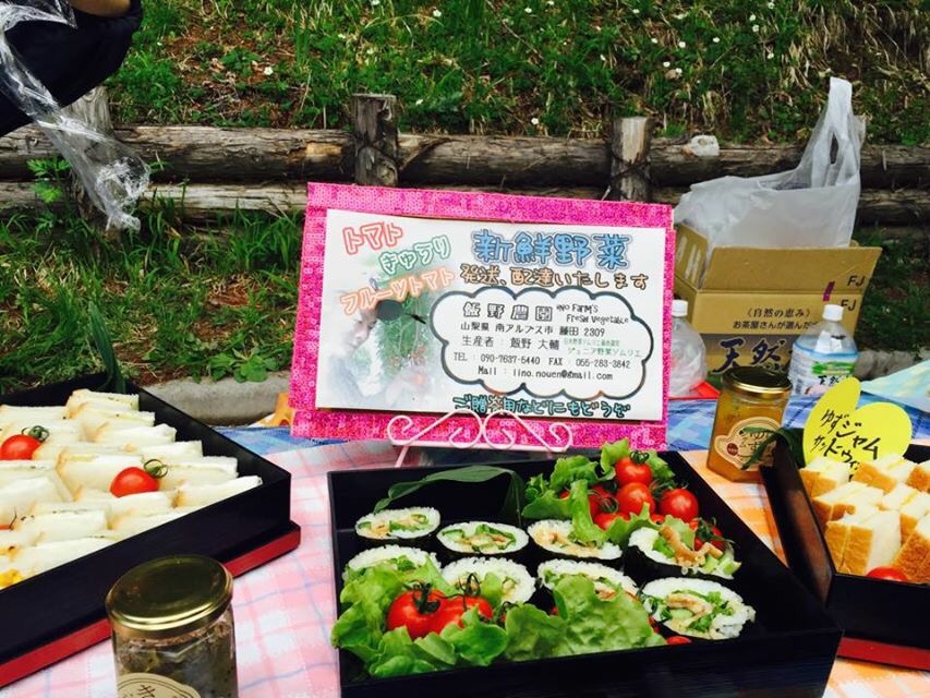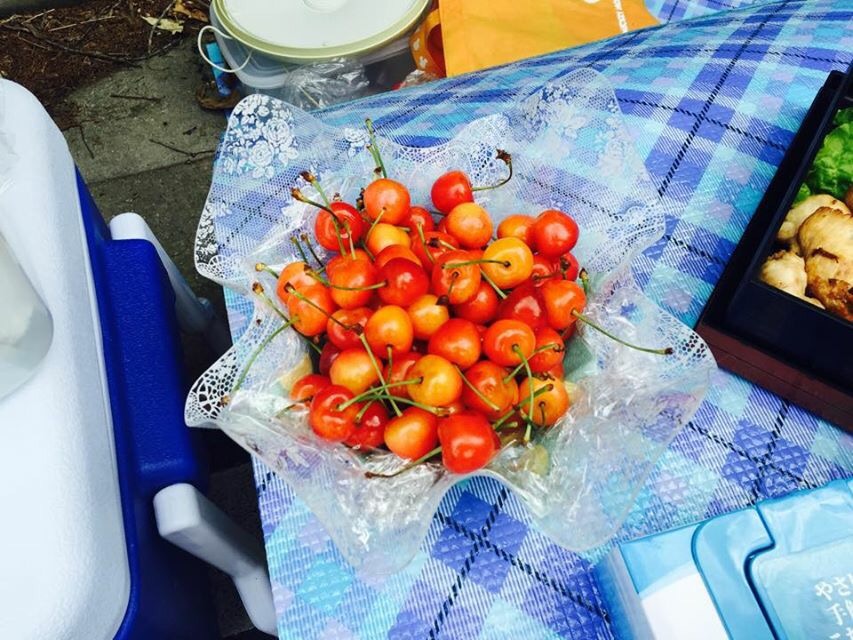 ほぼ食卓です。一般サラリーマンの家庭の食卓を越えてます。山梨名物ほうとうから始まり、海苔巻き寿司に唐揚げ、ボクの大好きな南アルプス名物サクランボ、キュウリと梅干とこれまたボクの好物ヤングコーンの酢漬け。疲れが抜けます、パワーがでます、お腹がいっぱいで走りたくなくなります笑