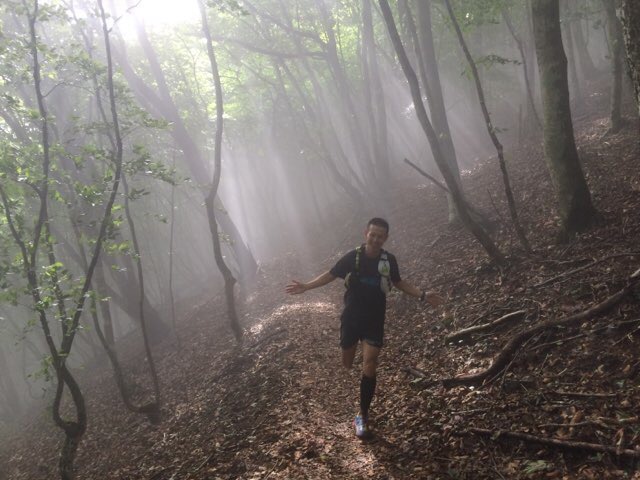 朝もやに太陽の光が!その中を走る先週上州武尊60kで優勝した青木くん!!