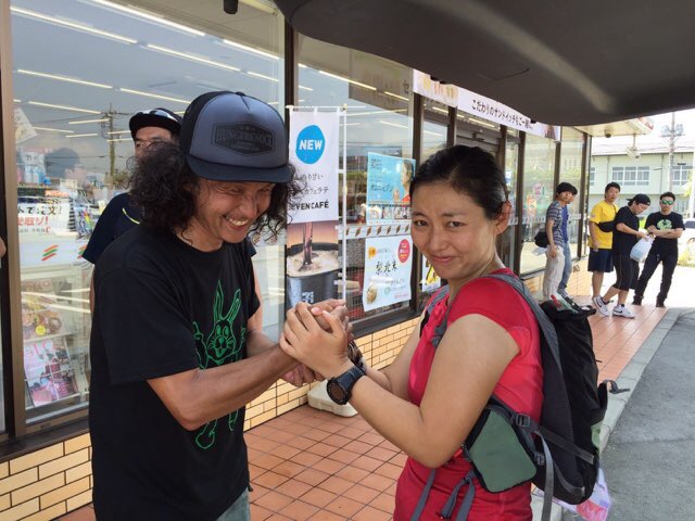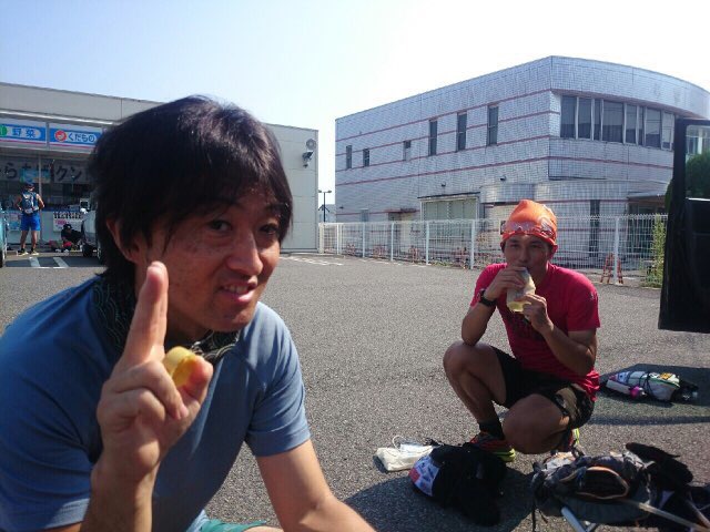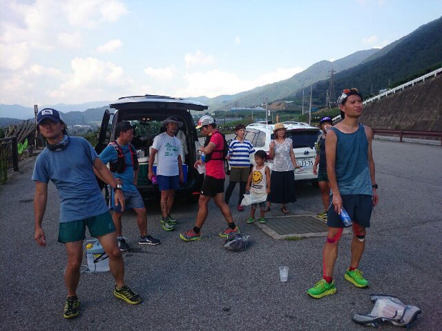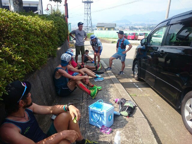 フルーツライン手前、チームメイトのタッツン親子が極冷えのキュウリを持って応援に来てくれました。タッツンは翌日の登山駅伝の選手の為ボンチは欠場。タッツンが青木くんに襷を渡す大役です。
