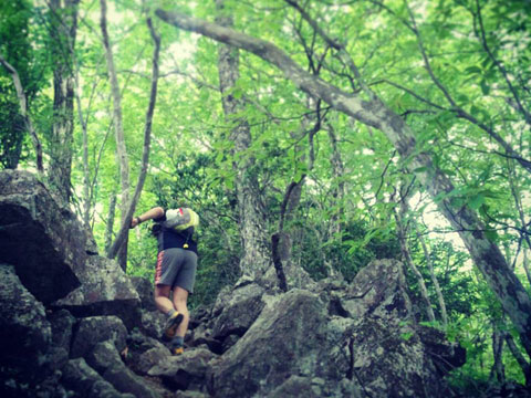 前半の山場、三頭山をひ〜ひ〜言いながら攻略。ここで一安心したのか、御前山手前で超失速。ハンガーノックだったらしく、補給で復活。ダコタ・ジョーンズが乗り移ったかのようにグイグイ登る(ただしスピードは1/10くらい)。