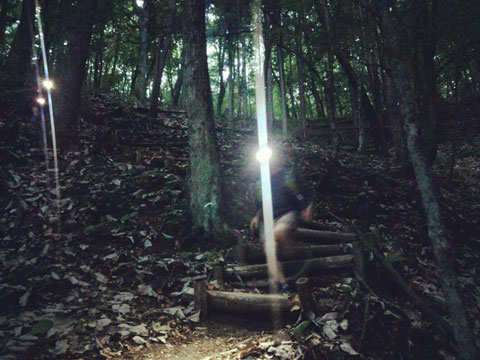 御岳山で水分を補給して、日の出山を越え、いよいよ金比羅尾根へ。街まであと3kくらいのところで大音響が聞こえてくる。夜中二時にだよ!