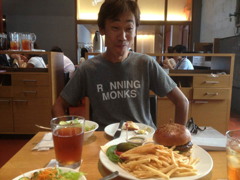 さて、クギッシーさんと行ったレストラン。都内某所の海沿いにあり、近くに外資系企業があるとのことで外国人も多く、まるで海外の雰囲気!外国かぶれのぼくはかなり気に入ってしまった。アメリカンスタイルのハンバーガーをいただいたが(ボリューム満点&美味!)、夜はがんばって走ってカロリーを消費しました。