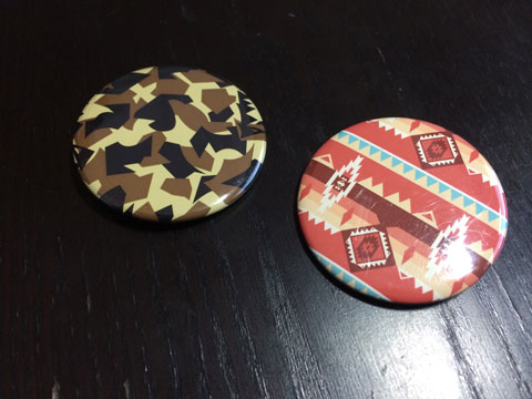 ノベルティにこのカモフラ柄の缶バッチを作りました(右のネイティブ柄缶バッチは配布終了)。