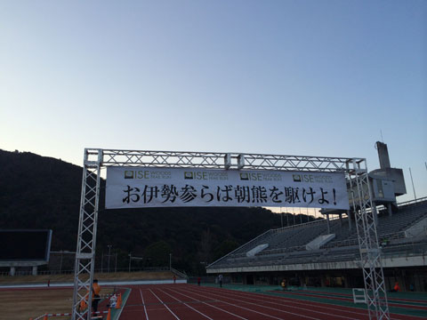 三重サンアリーナで受付を済ませ、バスでスタート地点の陸上競技場まで移動する。けっこう寒くて、みなさんトラックを走って身体を温めている。ぼくは体力温存。ちなみに心折れ部からは単独遠征なのだが「チーム代表として頑張ります!」なんて気持ちは全然なく、ゆるりと楽しむつもり。