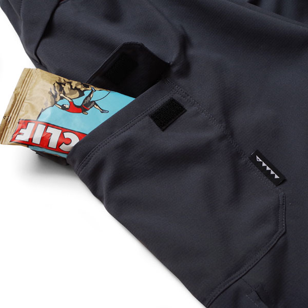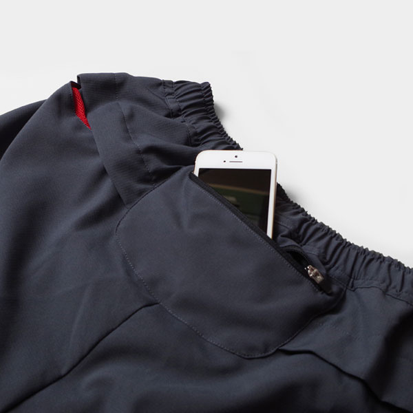 バックのセンターポケットはスマートフォンが入る大型ポケット。その両脇のヒップポケットはヒップがごわつかないように、浅めにしました。小さな補給食やゴミなどにお使いください。