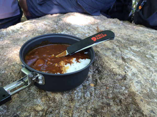 大岳山頂上で食事休憩。各自用意をお願いしていたが、塾長がレトルトのカレーを自家製乾燥米(本人曰く失敗作w)を持ってきてくれた。言ってみれば温めるだけなのだが、なんとも美味しい。