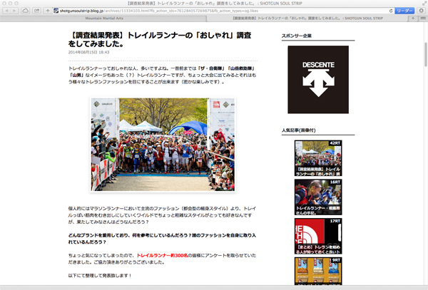 トレイルランナー300名にウェアやシューズのアンケートをとったらしい。ぼくの周りにはコアな方がわりと多いので、こういう第三者的な分析は参考になる。