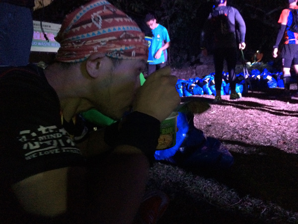 蚊取り線香さんが「次かその次のエイドで焼きそばとか炒飯があります」と言っていたので期待したが、あるのはカップラーメン。後から聞いた話だが、昨年まであった焼きそばと炒飯が今年からはなくなり、ずっとカップラーメンだったとのこと。完走したメンバーの中にはカップラーメンも4杯も食べた強者も。結局ぼくはバナナとオレンジだけ食べて出発。