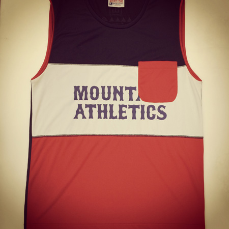 さて、今季の「レトロクラシックなスポーツスタイル」を象徴するアイテムのひとつ、3トーンに切り返したTシャツ。胸にはMOUNTAIN ATHLETICSのグラフィック(わざとプリントの上にポケットをつけています)。