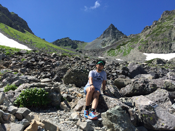 はじめましてだったけど(HOKA ONE ONEサポートランナーの着用するウェアは弊社でロゴプリントさせていただいております)、ミラーレス一眼を首から下げて、アスリートというよりは山男風な雰囲気が好感度大。この日はガイドサポートだったそうで、槍ヶ岳山荘の情報などをお聞きする。
