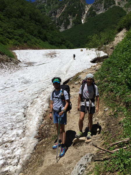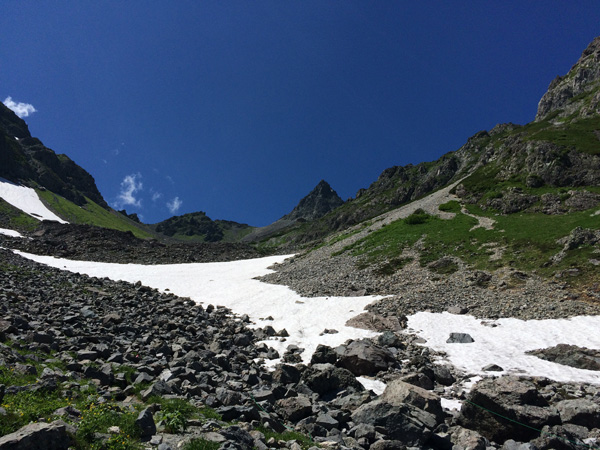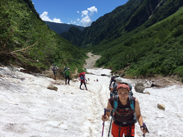 雪渓を渡る。蚊取り線香氏から雪渓を渡る際の注意事項の説明があった。こうして学ぶ細かい知識が、登山をする上での技術向上につながる。