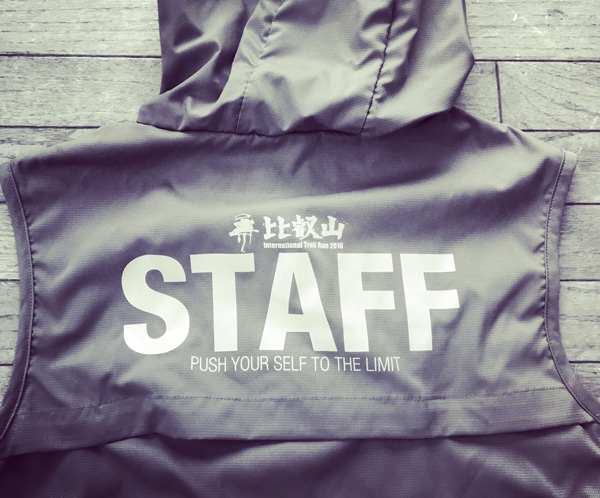 ぼくも昨年参加したこの大会(DNF)。かなり暑かった記憶がある。昨年のスタッフウェアはロングスリーブのナイロンシェルでスタッフの方々も暑かったらしく、そういったご要望をお聞きした上で、撥水素材のフード付きベストを提案させていただいた。