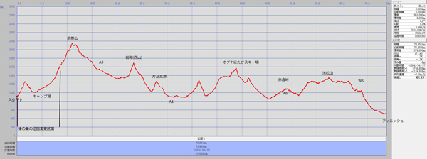 上州武尊60の高低図を見ると、登って下って登って下って登って下って登って下って(以下略)というコースであることがわかる。