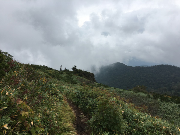 宝台樹のゲレンデを登って下ると、いよいよ武尊山の登りが始まる。なんと1100m。しかも正規の登山ルート(?)ではなく、わりと急登のルート。序盤はそこそこ調子よく登るも、途中から動悸息切れめまい発汗が激しい。武尊山頂につく頃には重力5倍に感じるくらい身体が重い。。。