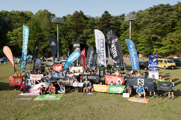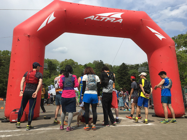 会場の裏がすぐトレイルなので、初日は各メーカーのザックをたすき代わりにしたトレイルランニングリレーを開催。すごいアイデア!
