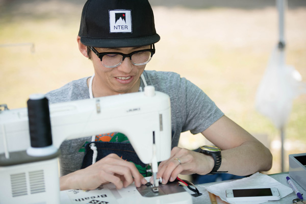 MMAブロガー、Trippersの朝長さん。「みなさんの思い出のゼッケンを持ってきていただければその場でポーチを作成してお渡しします」というオリジナルサービスでミシンフル稼動!