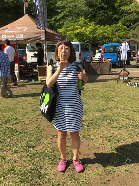 MMAブロガー、女王こと関さん。MMAのアイテムもいくつかデザインしてもらっていて、そのひとつボーダーワンピース着用。なんと縦走帰り。